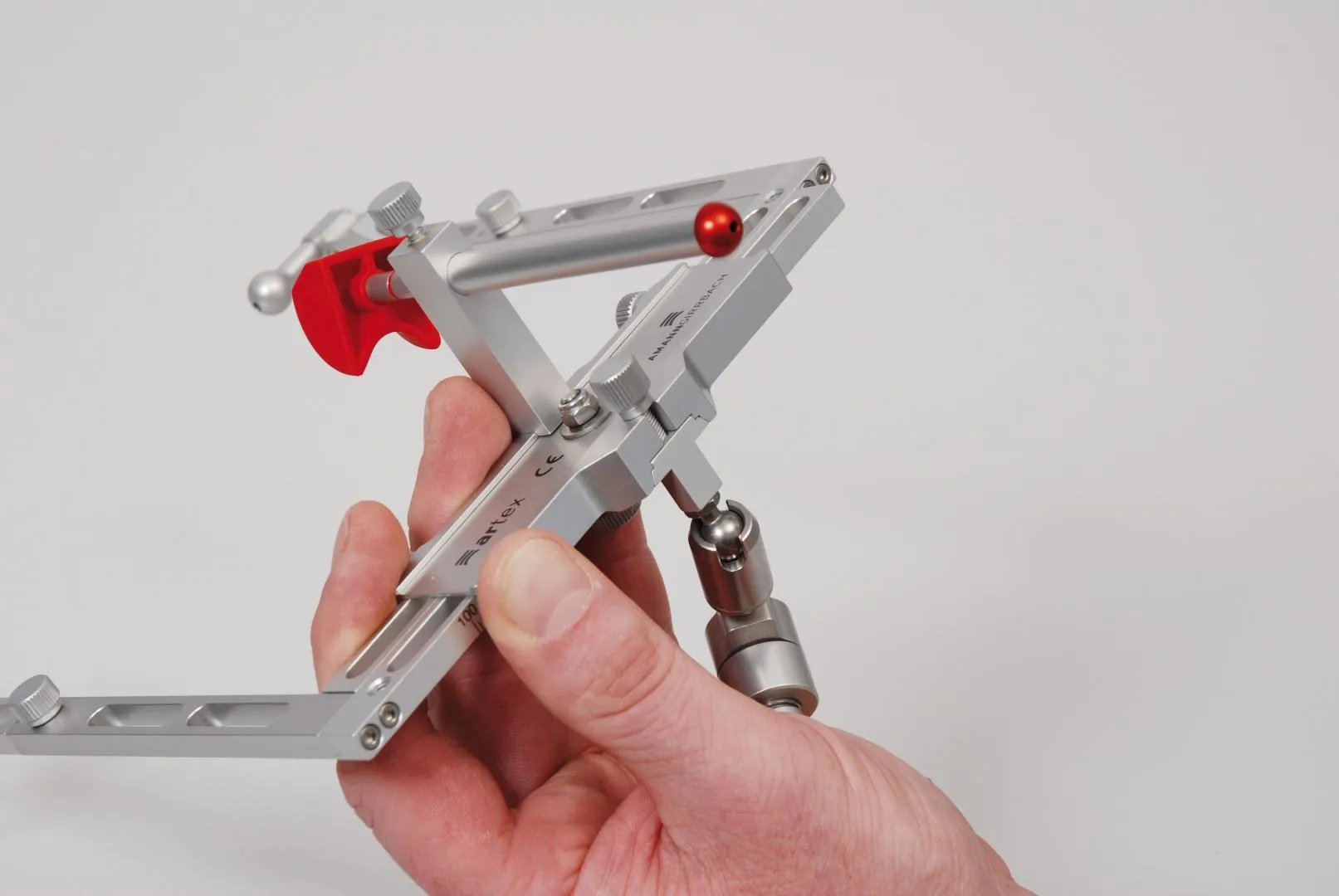 - Se fixează articulația 3D. Poziția astfel obținută a furcii în raport cu arcul facial se folosește pentru montarea modelului superior în articulator potrivit poziției pacientului.
