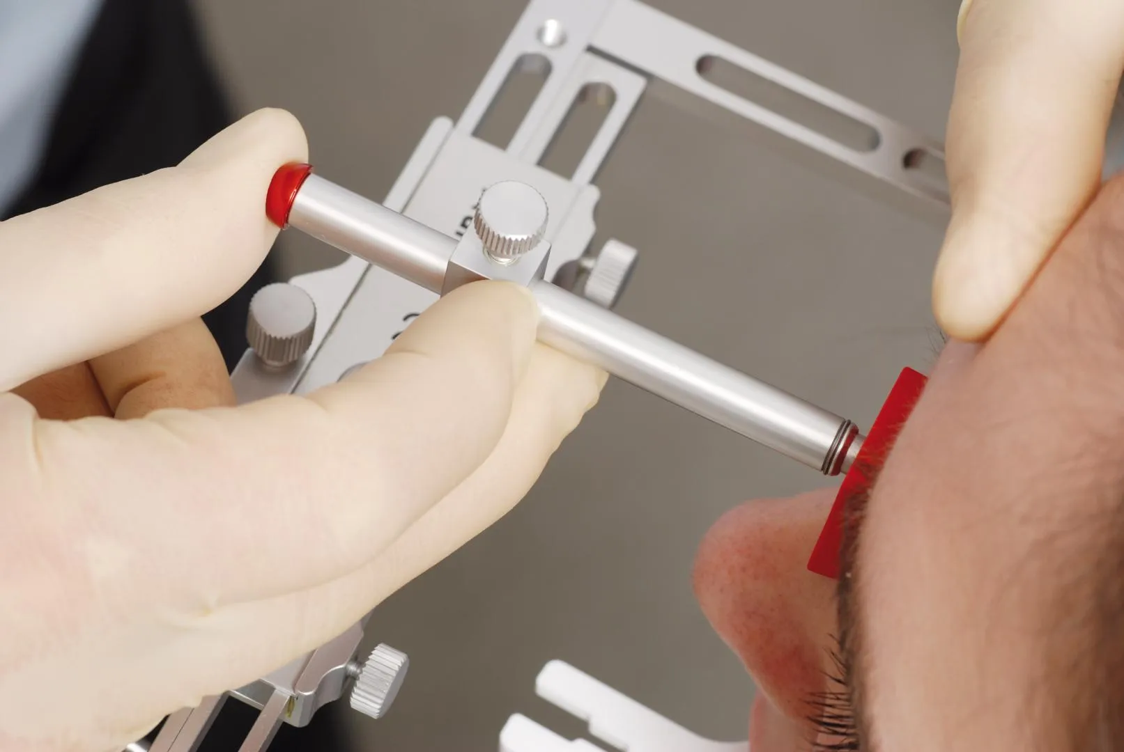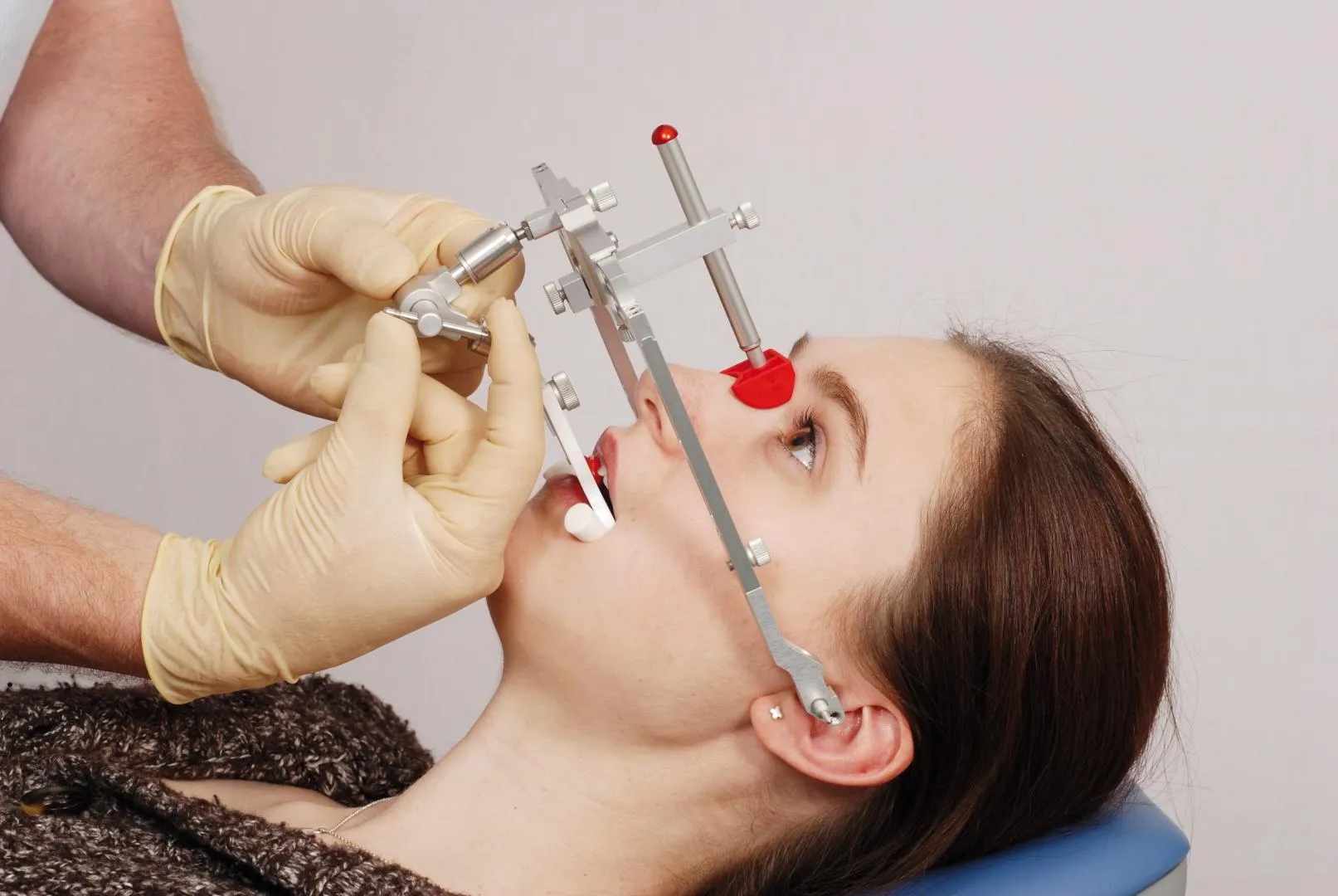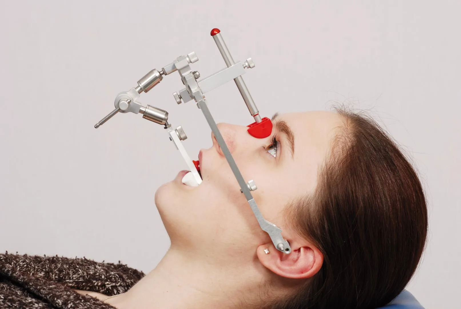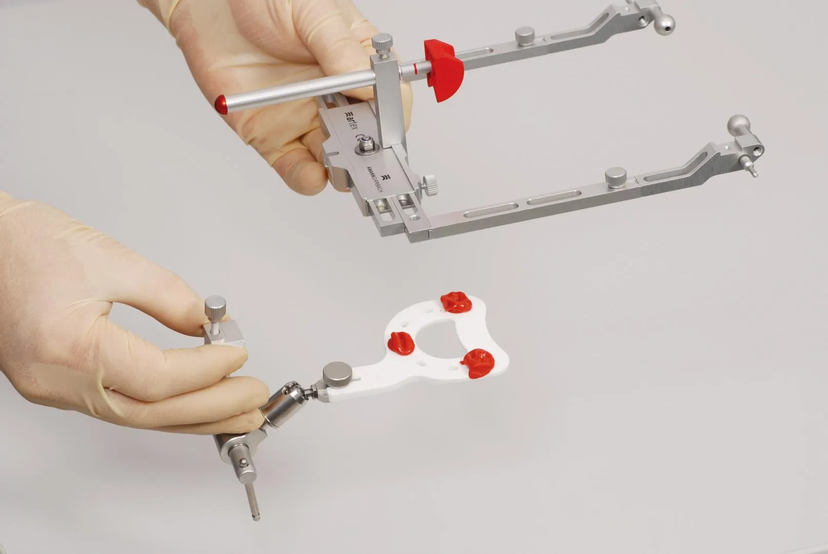 - Arcul facial este astfel fixat pe craniul pacientului printr-un sistem de montare în trei puncte (2 adaptoare auriculare Porus și sprijin în punctul nasion).