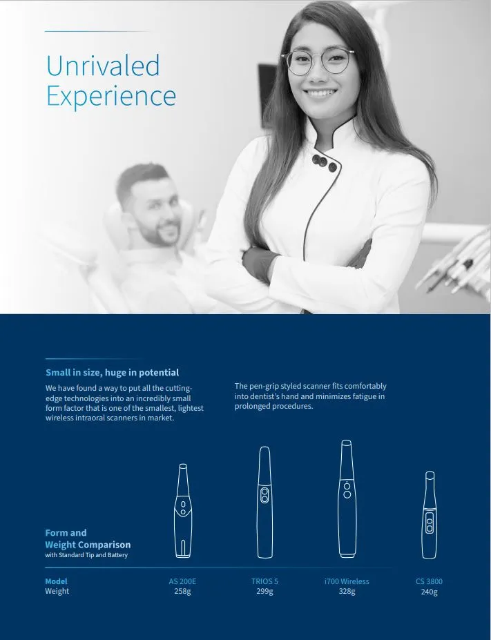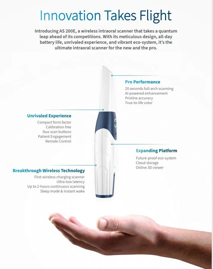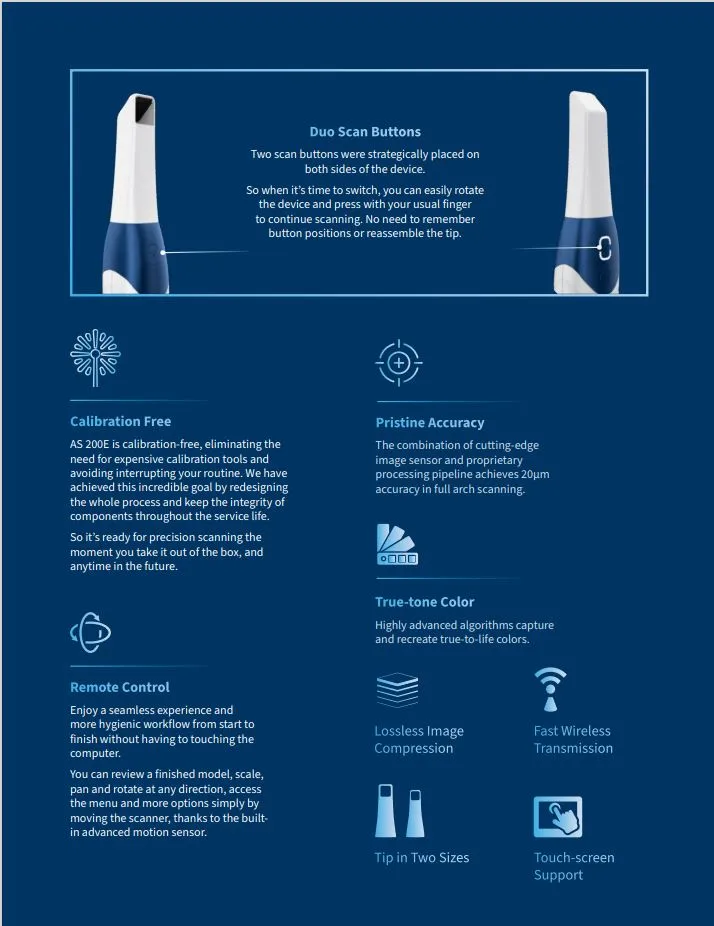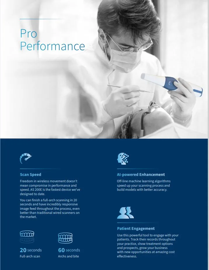 AS 200E is the fastest Intraoral Scanner device we’ve designed to date. You can finish a full-arch scan in as low as 20 seconds, even more capable than many flagship wired scanner on the market.