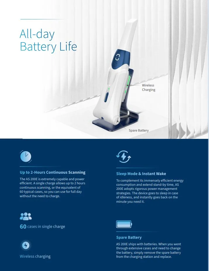 The AS 200E is extremely capable and power efficient. A single charge allows up to 2 hours continuous scanning, or the equivalent of 60 typical cases, so you can use for full day without the need to charge.