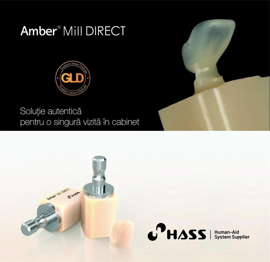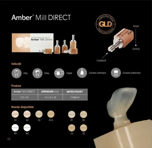 Amber Mill Direct este un bloc pe bază de disilicat de litiu pentru restaurări dentare frezate, nu necesită cristalizare.