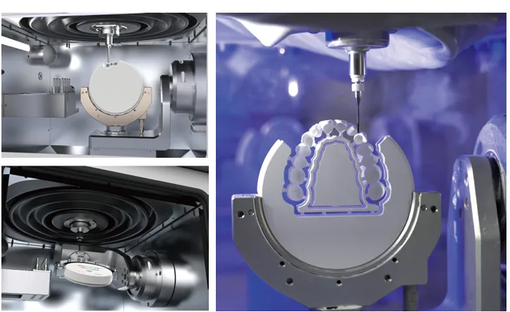 Mașina de frezat Aidite AMD-500E Pro este utilizată în principal pentru frezarea uscată in 5 axe CAD/CAM a materialelor dentare precum dioxid de zirconiu, PMMA, ceară, compozite etc. Aceasta se remarcă prin stabilitate și un design integrat cu protecție împotriva prafului. Este ușor de operat și permite gestionarea inteligentă a instrumentelor și procesare verticală la 90°.